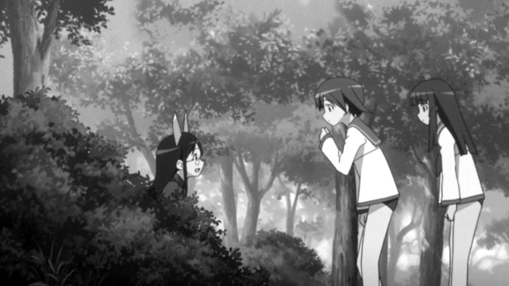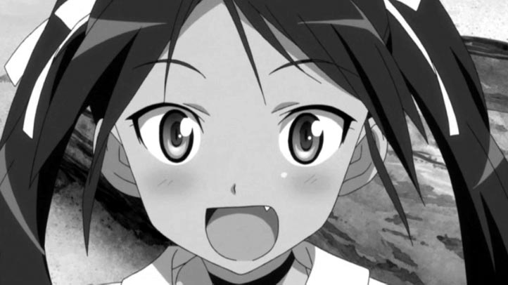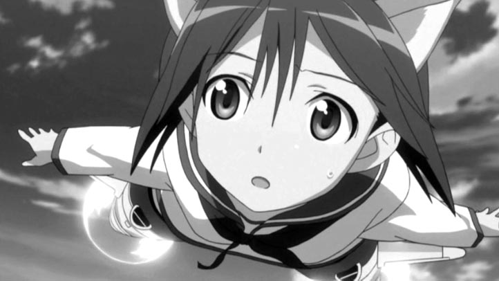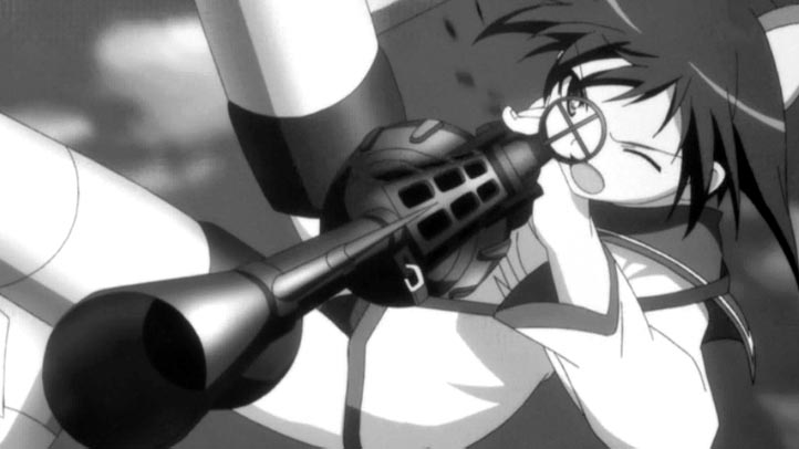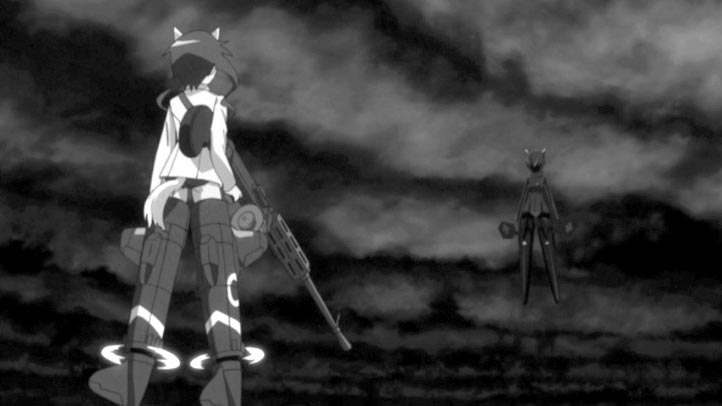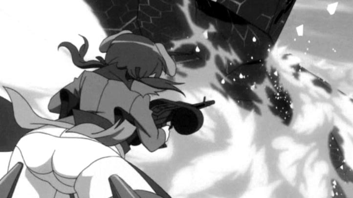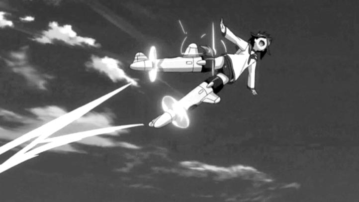 空中浮遊は戦闘という題目のために用意された舞台であるが、アクションとしての重量感は一切ない。作り手の目論みは、空中を舞台としたアクションにはなく、あくまでも少女たちの姿が中心であり、ストライカーユニットを装着して飛翔する瞬間のフォルムを描くことに意識が向けられている。