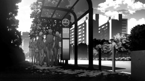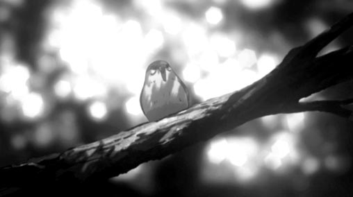 背景美術は色彩が抑えられ、近景は彩度が抑えられた落ち着きのあるディティールが描かれているが、遠景ほど極端にコントラストが強くなり、真っ黒な影になって沈む。虹色の光がじわりと滲み出し、その効果が前面に立っているキャラクターの印象を強くさせている。