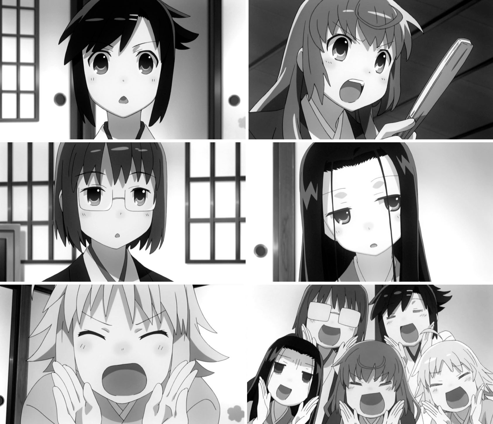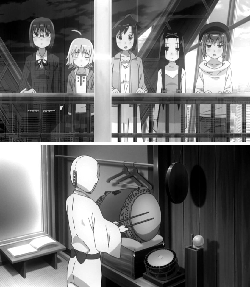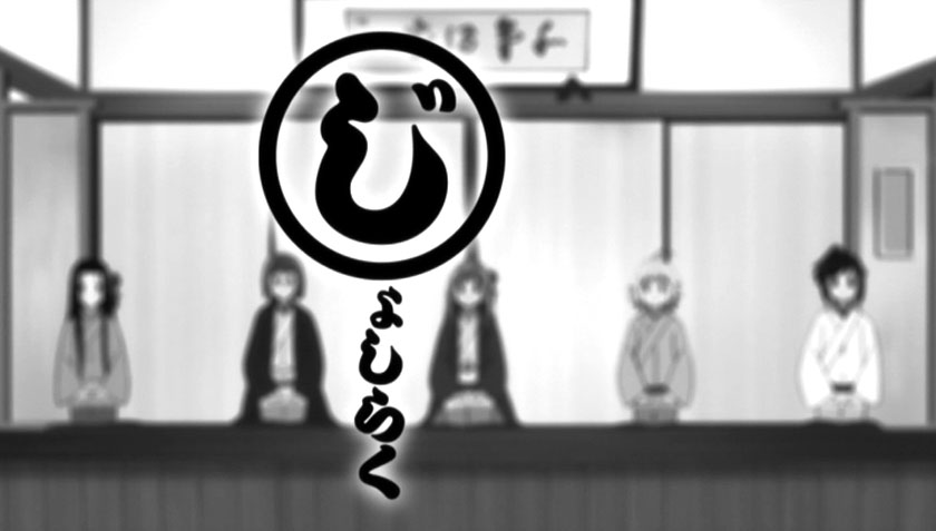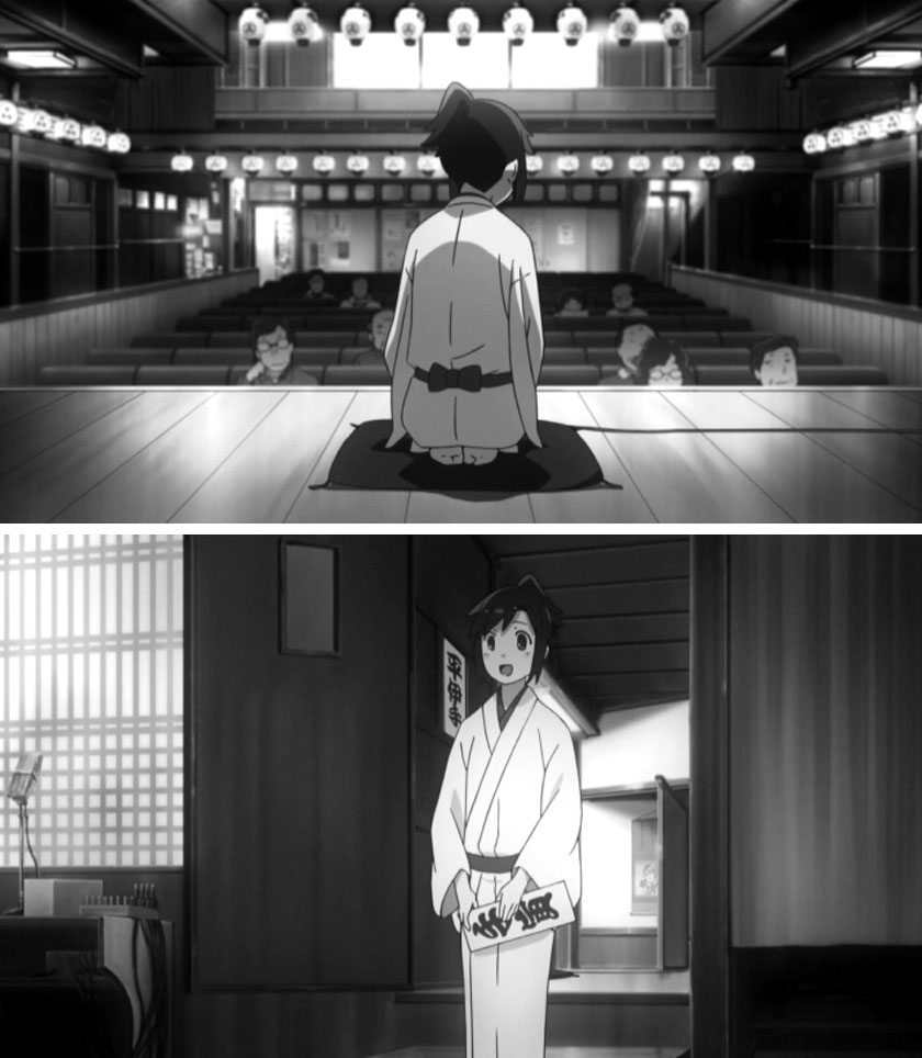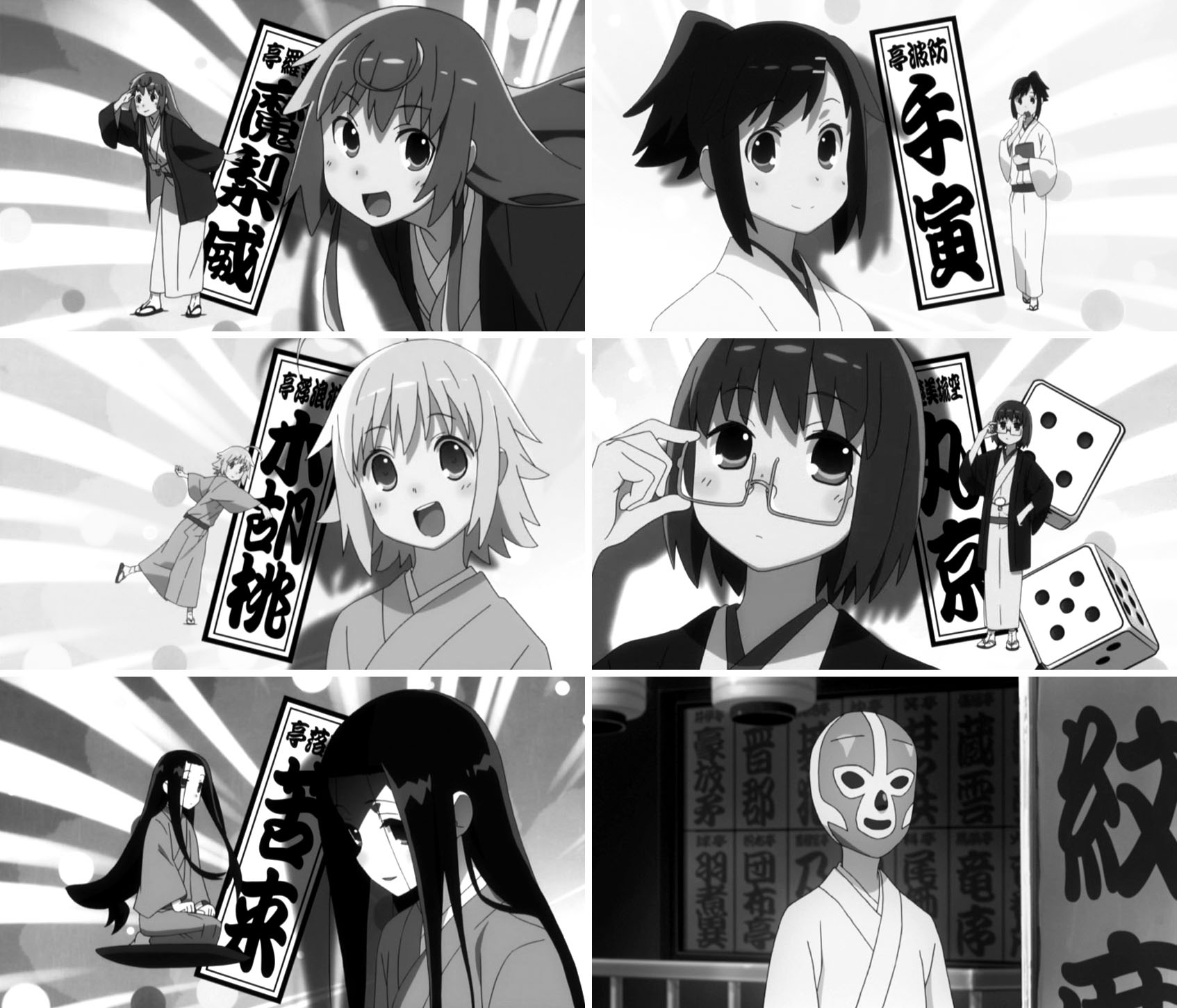 『じょしらく』は落語家の少女が主人公であるものの、落語は特に重要なモチーフではない。舞台は楽屋であるが、楽屋という特異性は重要視されず、少女たちも和装姿であるが、これはただその場所と符号させるための変異的な制服といったところで、やはり重要というわけではない。