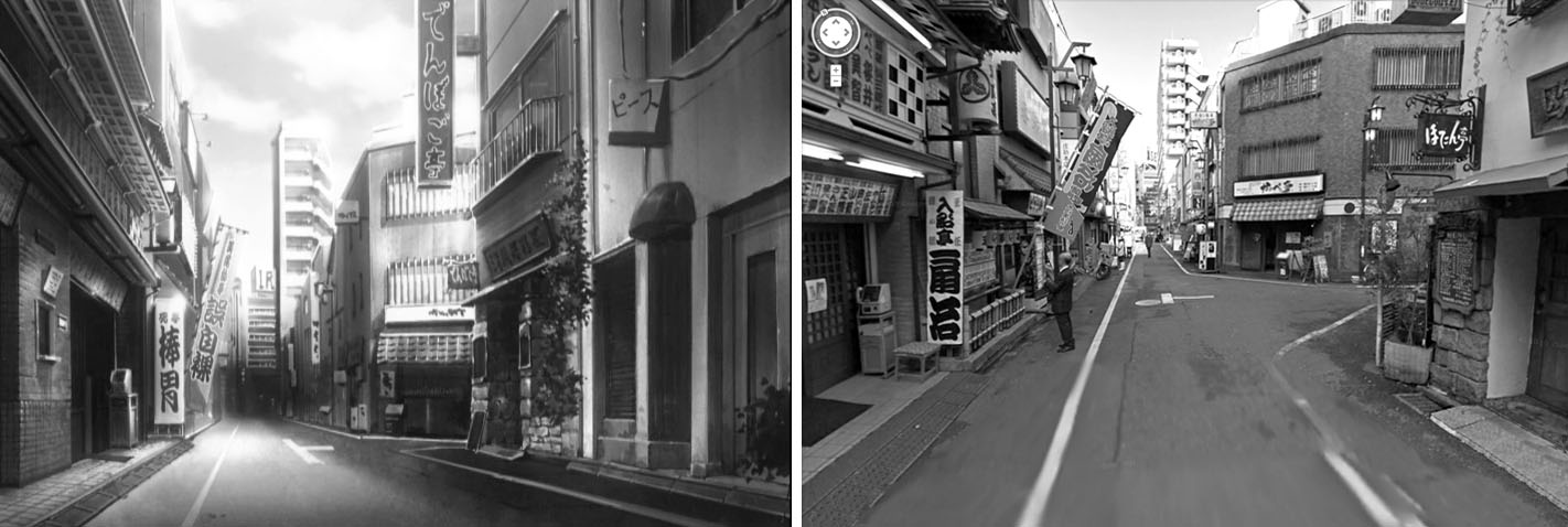 モデルとなっているのは【新宿末廣亭】で間違いないだろう。アニメの一場面とグーグルビューを比較すると、ほぼ一致した。寄席だけではなく、周囲の町並みまでそのまま描かれている。場所を特定し、落語の