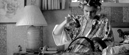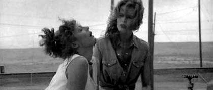 男性の登場シーンは色彩を削除してもあまり印象が変わらない。『テルマ&ルイーズ』には必ず、どこかしらに男性の影がある。テルマとルイーズは、男性の存在の横で揺れ続けている。