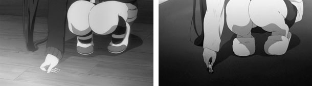 映画の最後のシーンは4人の足下を長回しで捉える。脚の動きはフルコマ。脚の動きだけでそれぞれの感情を表現している。脚で感情を表現する手法を続けてきた『けいおん!』の最後を飾るのに相応しいカットだ。動画枚数が多く、カット袋ではなくカット箱になったそうだ。