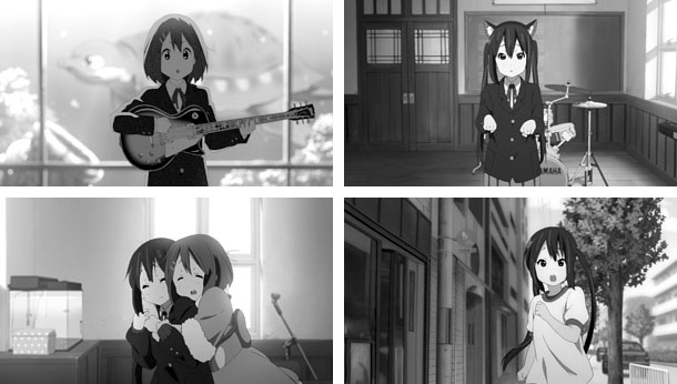 いずれもSCENE58、中野梓の夢の中の場面。中野梓の記憶が奇妙な空気感を伴ってレイヤリングされている。右上は第1期第9話『新入部員!』から、左下は第1期最終回『軽音!』から、右下は第2期第15話『マラソン大会!』から。第1期最終回の記憶なのになぜか「トンちゃん」がすでにいたり、中野梓が制服で平沢唯が舞台衣装になっているなど、実際と違う点が意識的に描き出されており、これがこの場面の奇妙な心地を醸成している。夢の中にありがちな光景をうまく映像化している。
