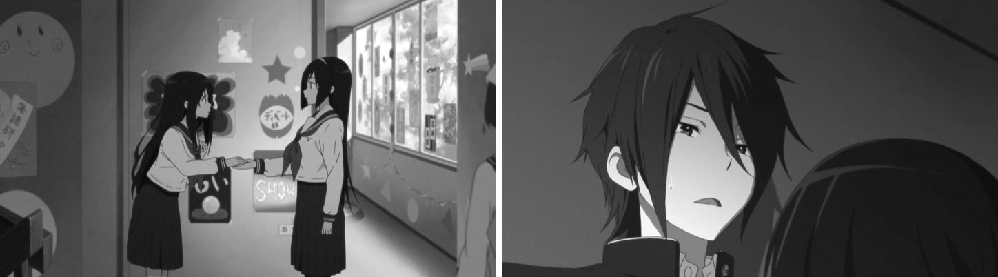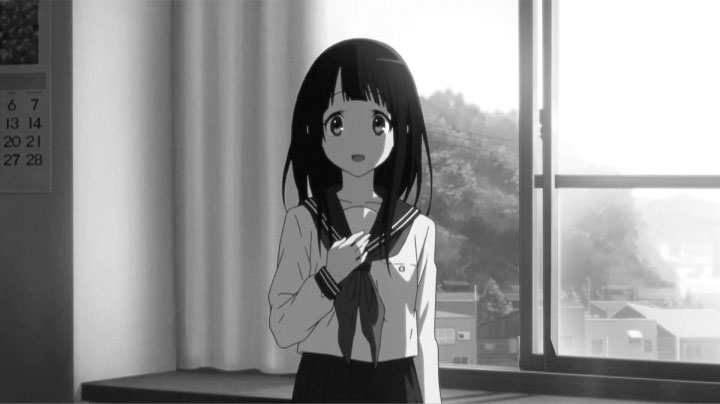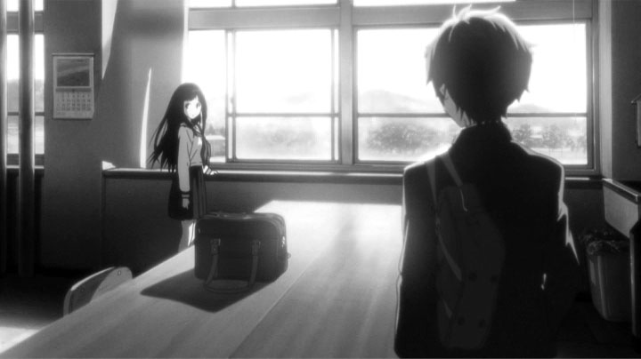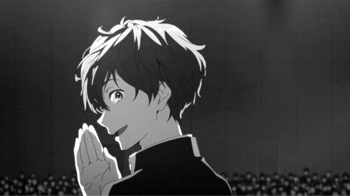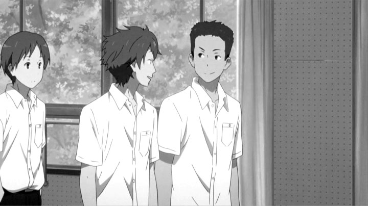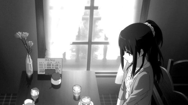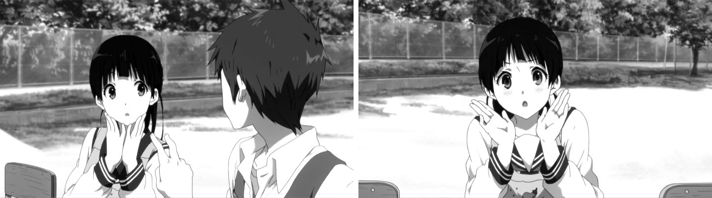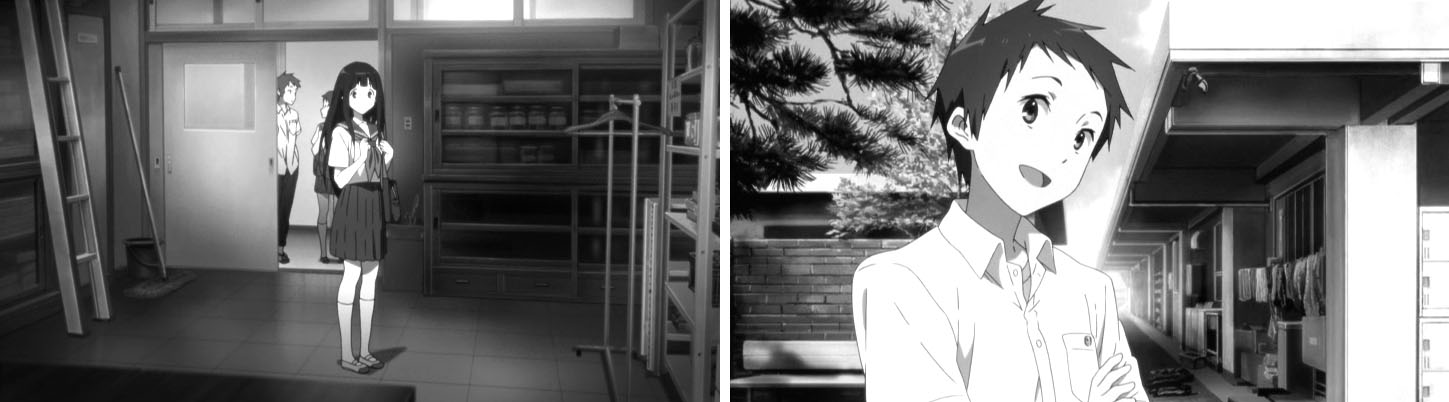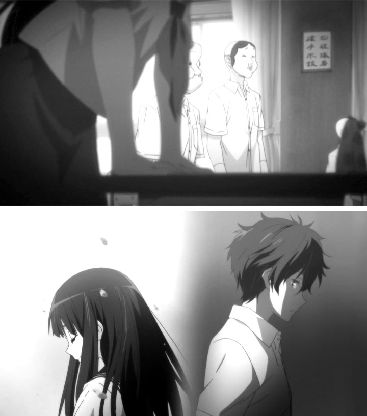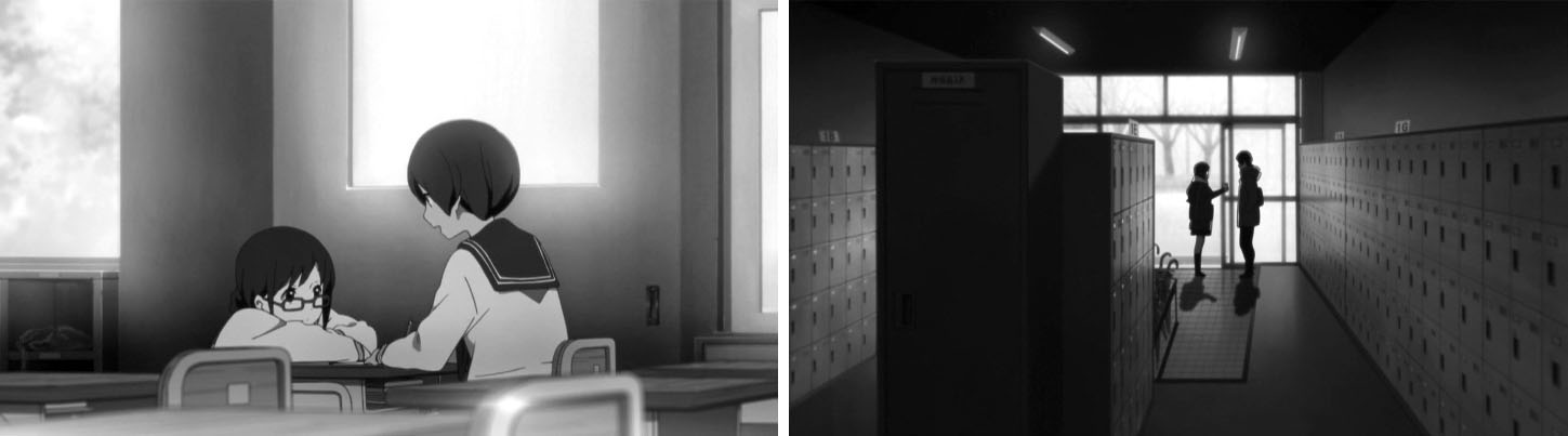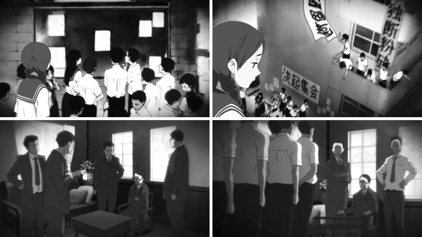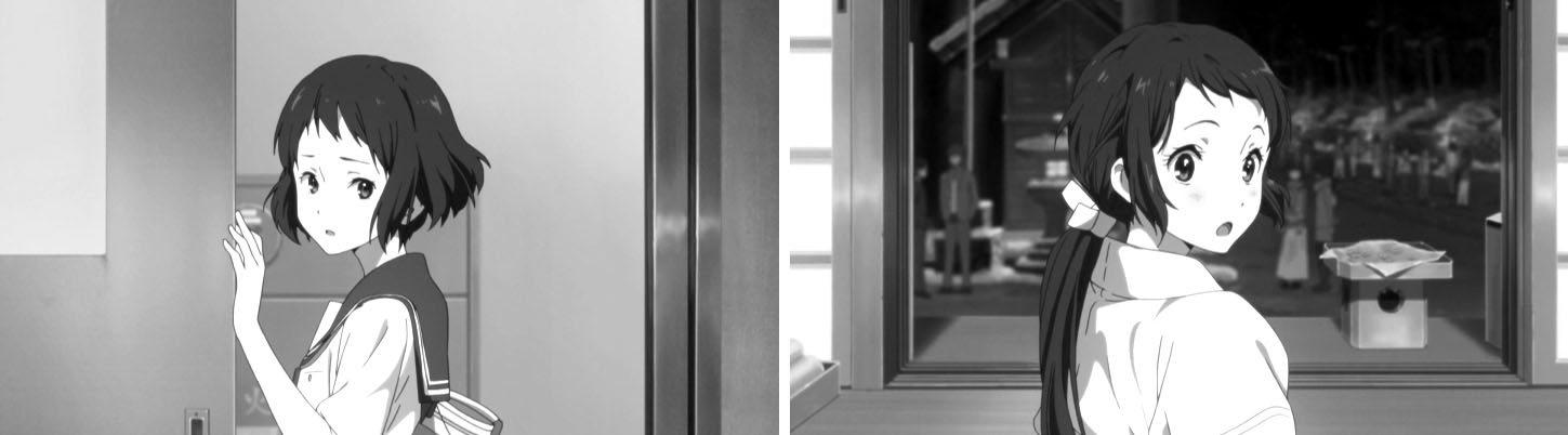 教室でのゲリラライブを通して卒業までのわずかな日数、画面の色彩はにわかに淡く漂白していく。テレビシリーズで、色彩の差で学校に留まる者、卒業する者との間にある空気の差を表現していたが、おそらく狙いは同じところにあるのだろうと考えられる。