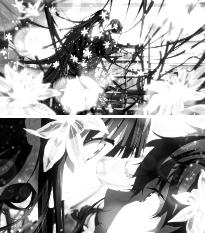 白いバラに囲まれた花園は、大人になった澪たちが子供時代を回想した場面、あるいはそのイメージと考えられる。同じ制服に閉鎖された空間、つまりここは学校、あるいは学生時代である。