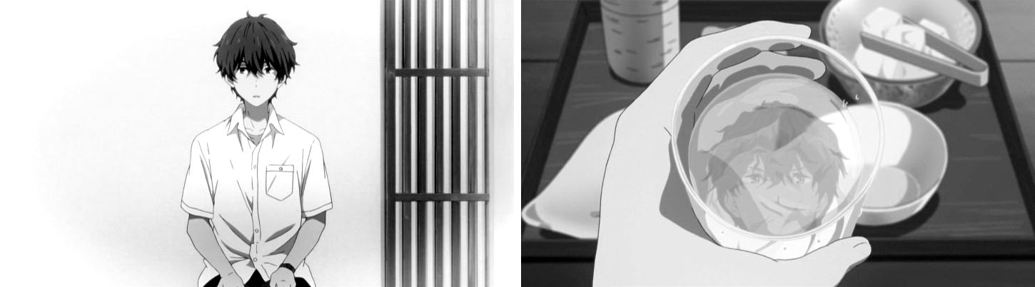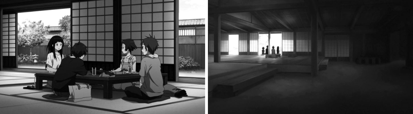 寿司屋「蘭鋳」での一場面。唯たちの演奏の最中、なぜかクローズアップされる衝立。絵コンテの段階から描かれる。演奏のリズムの間を埋めるため、尺の間を埋めるためのカットだが、なにやら謎めいた感じになってしまっている。