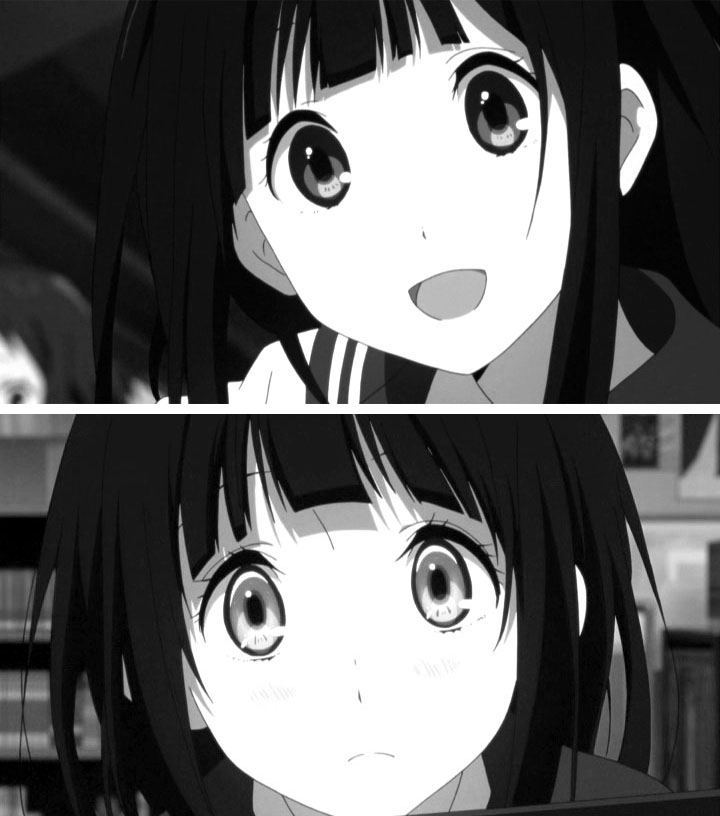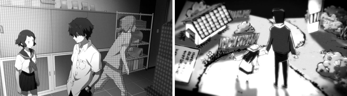 キャラクターの表現は顔のディティールばかりに集中し、身体へ向けられていない。構図のほとんどが顔面、それも極端なクローズアップで首と額で切り取られ、表情と台詞の芝居だけで物語を進めようとしている。身体の表現も多少は見られるものの、顔面への執着と比べると圧倒的に線の量も影塗り分けの数も減る。全身が動くカットは少なく、カメラがフルサイズからロングサイズなどになると殆どの場合が「止め」、あるいは合成処理でほんの一部が動くだけ、そうでなければ歩きや走りといった教科書的な単調なアクションだけである。