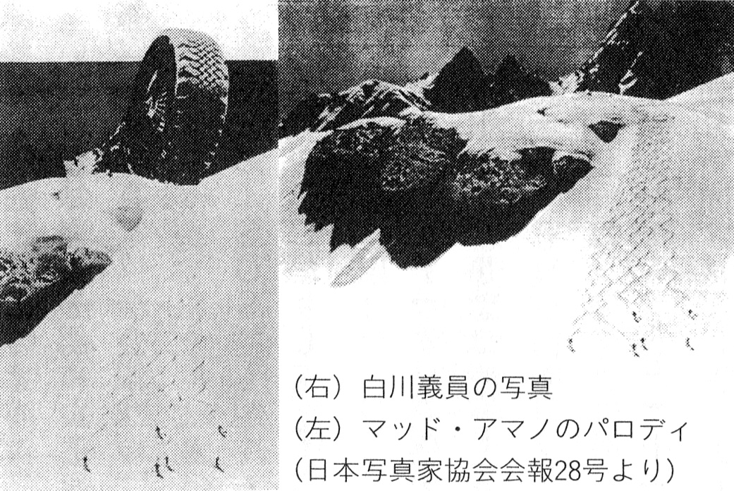 この場合のパロディは、“笑い”が狙いではない。この事例のようにパロディとして再構築することで、風景写真が風刺メッセージを得ることだってある。またマッド・アマノのこのパロディは、白川義員が撮影した写真に、ヘリコプターで現地に乗り込み、まっさらな雪原にスキーヤーを走らせる行為に自然破壊的なものを読み取り、その側面をクローズアップさせた。写真家が意図していない側面すらもパロディが突いて見せたのだ。
